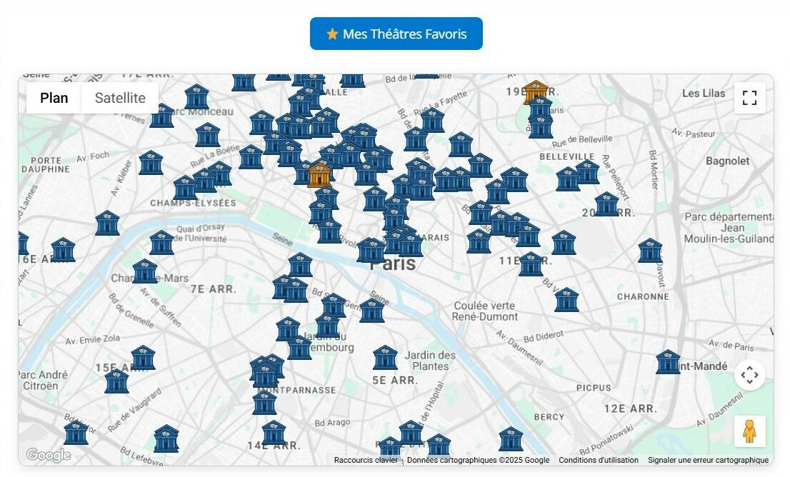 Nous avons cartographié 178 salles de Théâtre à Paris. Devenez Membre et ajoutez vos Théâtres préférés dans vos favoris. Ils apparaitront dans la rubrique Mes favoris.